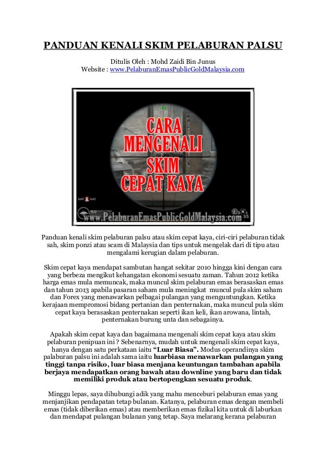 Kadangkala mereka akan menasihati untuk mengelakkan daripada menghubungi sesiapa sahaja dan supaya anda hanya mempercayai mereka sahaja. Skim skim ini mungkin merupakan skim cepat kaya atau dipanggil skim ponzi yakni wang pelaburan yang terkumpul digunakan untuk membayar pulangan lumayan kepada pelabur lain. 15032019 MENGGUNAKAN terma Islamik serta menyamar sebagai ustaz merupakan antara taktik penipuan skim pelaburan cepat kaya yang berjaya memperdaya orang ramai menyertai skim tersebut.