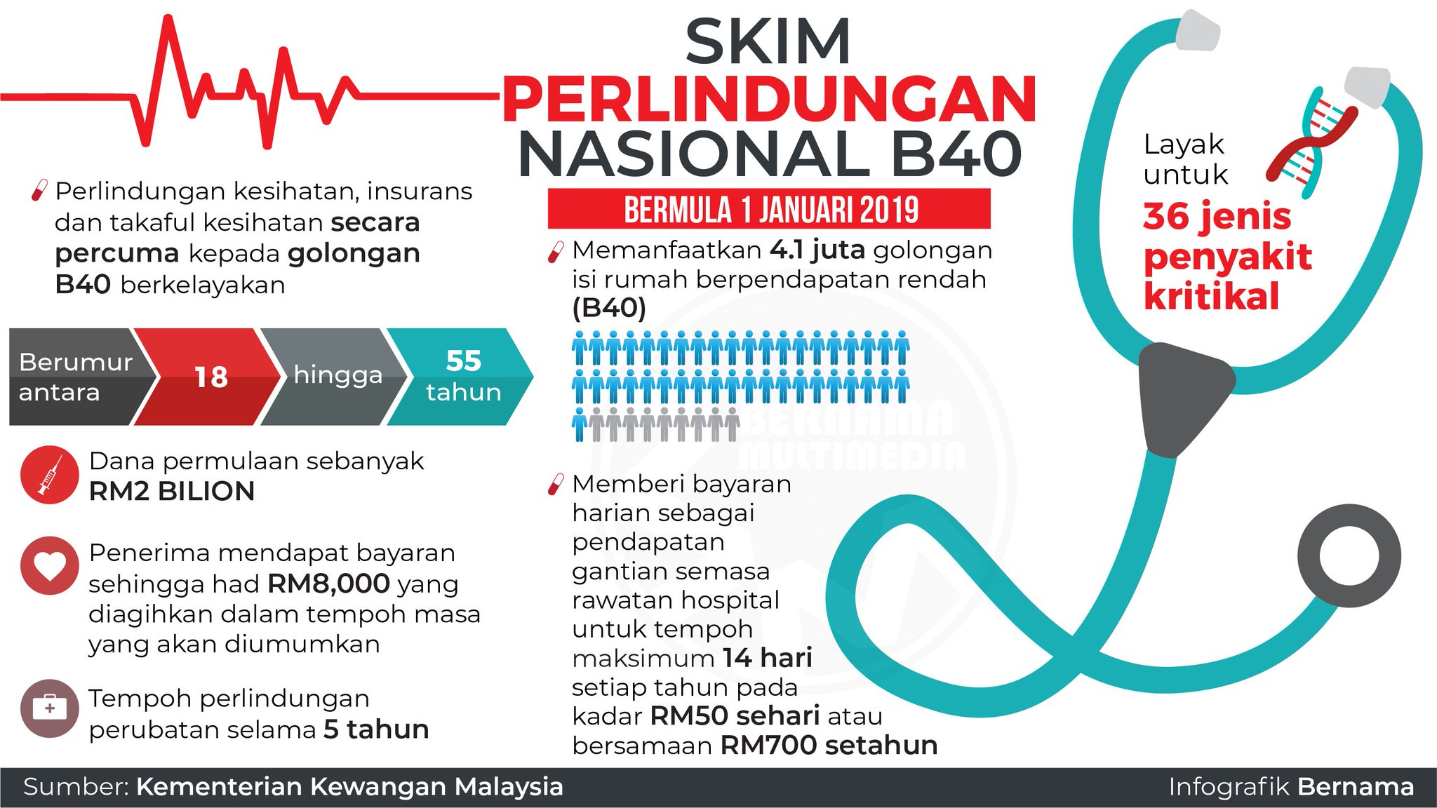 28122018 SKIM Perlindungan Nasional B40 yang menawarkan perlindungan insurans dan takaful kesihatan secara percuma kepada golongan berpendapatan rendah yang berkelayakan akan dilaksanakan bermula 1 Januari ini. Skim Perlindungan Nasional B40 menawarkan perlindungan kesihatan secara percuma kepada penerima yang layak bagi 45 jenis penyakit kritikal seperti jadual yang disediakan di bawah. Jumaat dis 28 2018 siaran media kementerian kewangan malaysia mulai 1 januari 2019 skim perlindungan nasional b40 bernilai rm2 bilion ditawarkan secara percuma kepada golongan b40 dengan bayaran maksimum sebanyak rm8000 untuk penyakit kritikal dan rm50 sehari untuk maksimum 14 hari atau rm700 setahun.