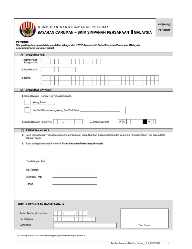 Ini bermakna ahli yang menyumbang secara sukarela ke akaun KWSP melalui Skim Persaraan 1Malaysia SP1M Skim Caruman Pilihan Sendiri dan Caruman Penambah Simpanan boleh berbuat demikian dalam mana-mana amaun. Skim Persaraan 1 Malaysia. Isi Borang KWSP 6A2 dan buat bayaran minima sebanyak RM50.