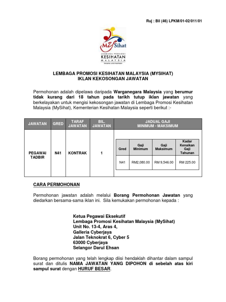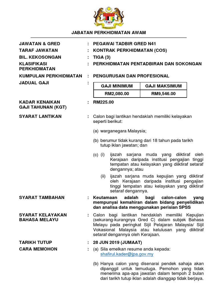 5 Februari 2018 2. Berumur tidak kurang dari 18 tahun dan tidak melebihi 58 tahun pada tarikh tutup iklan jawatan SYARAT LANTIKAN KELAYAKAN LANTIKAN KE GRED N41. Tidak Kenaikan Pangkat ke.