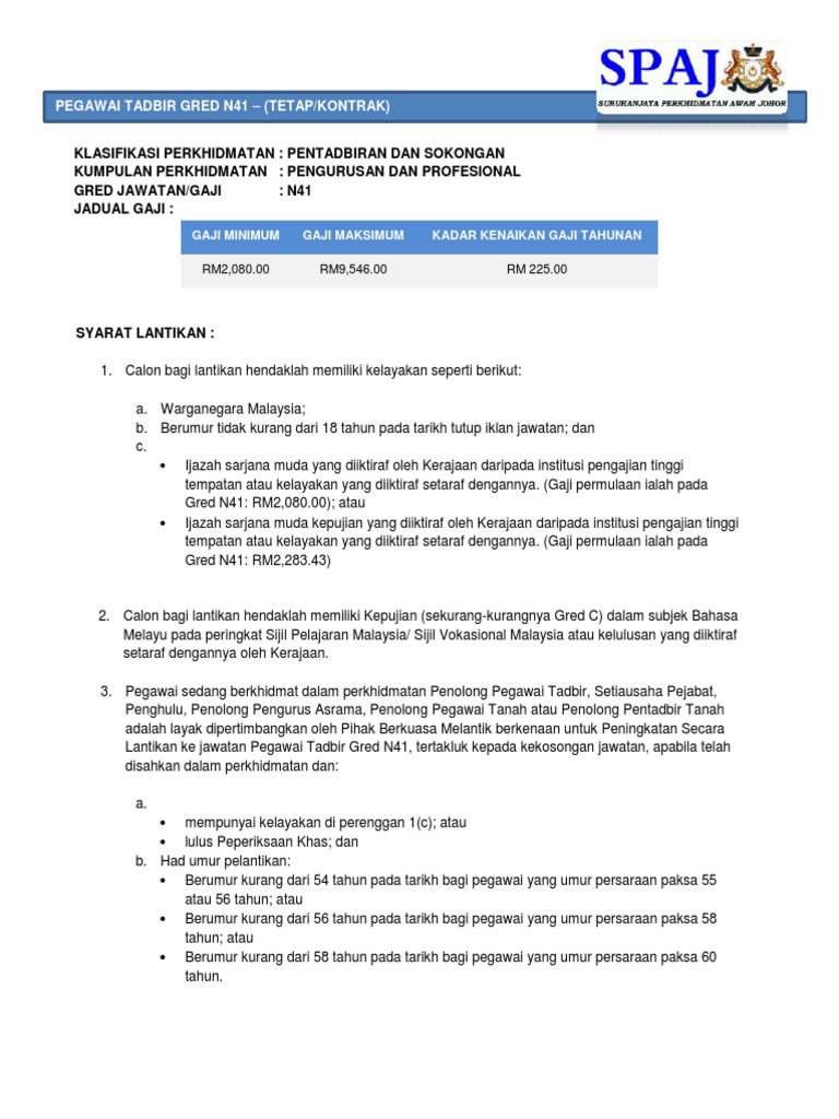Pegawai sedang berkhidmat dalam perkhidmatan Penolong Pegawai Tadbir Setiausaha Pejabat Penghulu Penolong Pengurus Asrama Penolong Pegawai Tanah atau Penolong Pentadbir Tanah adalah layak mendapat pertimbangan oleh Pihak Berkuasa Melantik berkaitan hal Peningkatan Secara Lantikan ke jawatan Pegawai Tadbir Gred N41 bergantung kepada kekosongan jawatan. RM553125 - RM895552 Gred N54. Matlamat Peperiksaan ini adalah-.